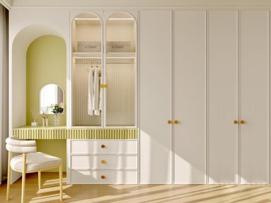 นี่คือ ตู้เสื้อผ้าสไตล์ฝรั่งเศสสีขาวแบบมินิมอล ด้วยเส้นสายเรียบง่ายและช่องประตูโค้ง ผสานกับโต๊ะเครื่องแป้งสีชาร์เทรอส ช่วยให้ตู้ทั้งหมดดูสดชื่นและโรแมนติก